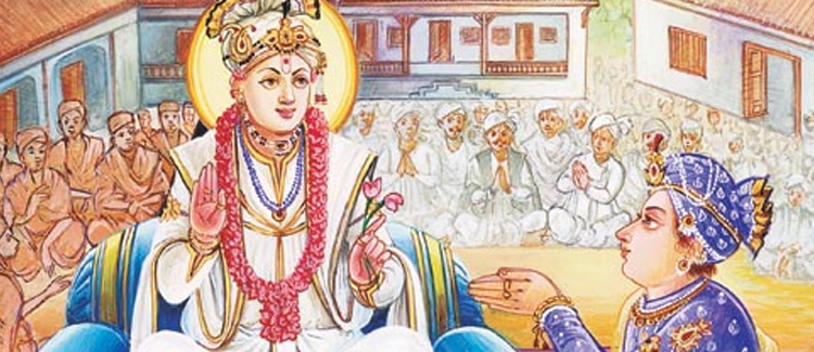 Varniji crossed the black mountain and proceeded further. White Mountain was seen from a distance Varni was pushing ahead towards the mountain. All of a sudden there came out many lions from the dense forest and stood before Varni. “Welcome! ? ” said Varni. Varni sat there and there...